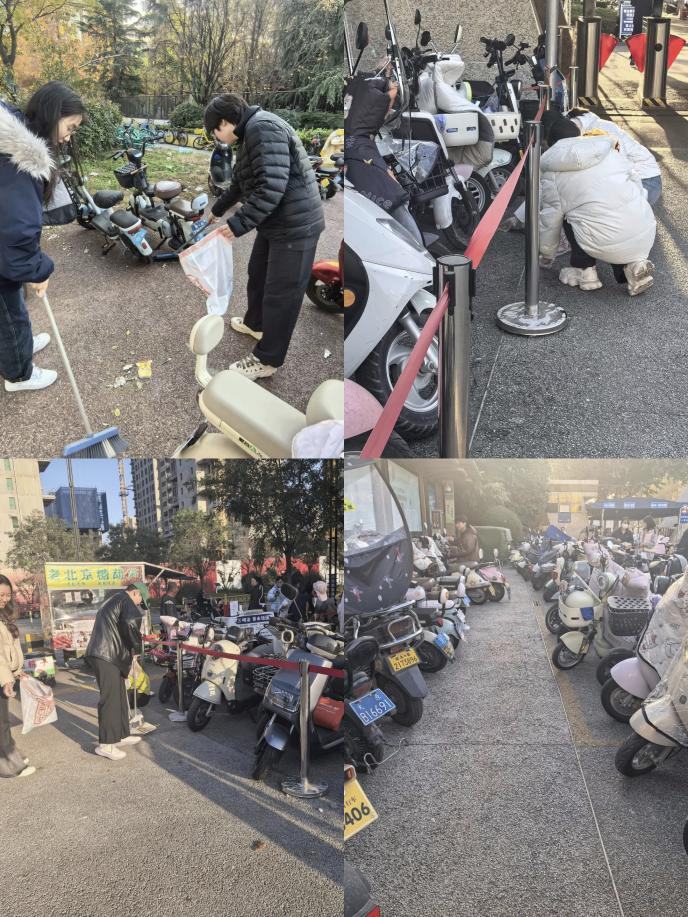 活动前期,支部支委提前实地勘察校园门口区域,结合环境卫生情况科学划分清扫责任区,明确各组具体任务清单与安全注意事项,确保活动有序高效开展。活动伊始,参与成员热情高涨、踊跃参与,自愿结对组成多个清扫小队,迅速领取扫帚、铁锹、抹布、垃圾袋等清洁工具,以饱满的精神状态投入到卫生整治工作中。清扫过程中,大家分工明确、协同发力,展现出极强的集体凝聚力:有的弯腰俯身,细致清扫路面上的落叶、纸屑、烟头及各类白色垃圾,不放过任何一处角落缝隙中的卫生死角;有的手持抹布,蘸取清洁液认真擦拭校门口的宣传栏、指示标识牌、公交站台座椅等公共设施,全力去除表面的灰尘、污渍与顽固印记,让公共设施重焕洁净光泽;还有的主动规整周边零散停放的车辆、摆放杂乱的共享单车及各类杂物,耐心清理隐藏在绿化带中的垃圾盲区。