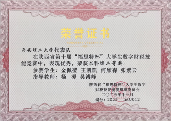 近日,2025 年陕西省第十届“福思特杯”大学生数字财税技能竞赛决赛落幕。bv1946伟德官网金佩莹、王凯凯、何颀森、张紫云四位同学组成的代表队,在杨潭、吴溥峰老师指导下,获本科组省级二等奖,彰显了学院实践教学成果。