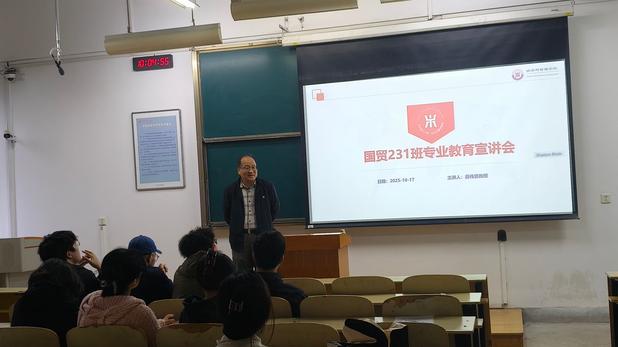 1017日上午,首场讲座面向2023级国际经济与贸易专业学生举行。活动特邀薛伟贤教授(二级教授、博士生导师)开展了题为“国际经济与贸易专业介绍与前景分析”的专题报告。薛伟贤教授首先从“一带一路”倡议、双循环发展格局、气候变化与低碳经济等宏观背景出发,深入剖析了国际经济与贸易专业面临的机遇与挑战,强调了具备国际视野的重要性。随后,薛老师系统阐释了国际贸易模式与利益分配机制,明确了专业培养目标与职业导向,指出优秀国贸人才不仅需要具备扎实的理论知识,还需具备良好沟通能力、外语水平、平台运营与计算机技能等复合能力。最后,薛老师梳理了相关的职业证书与提升路径,鼓励同学们主动规划、积极实践,增强就业竞争力。