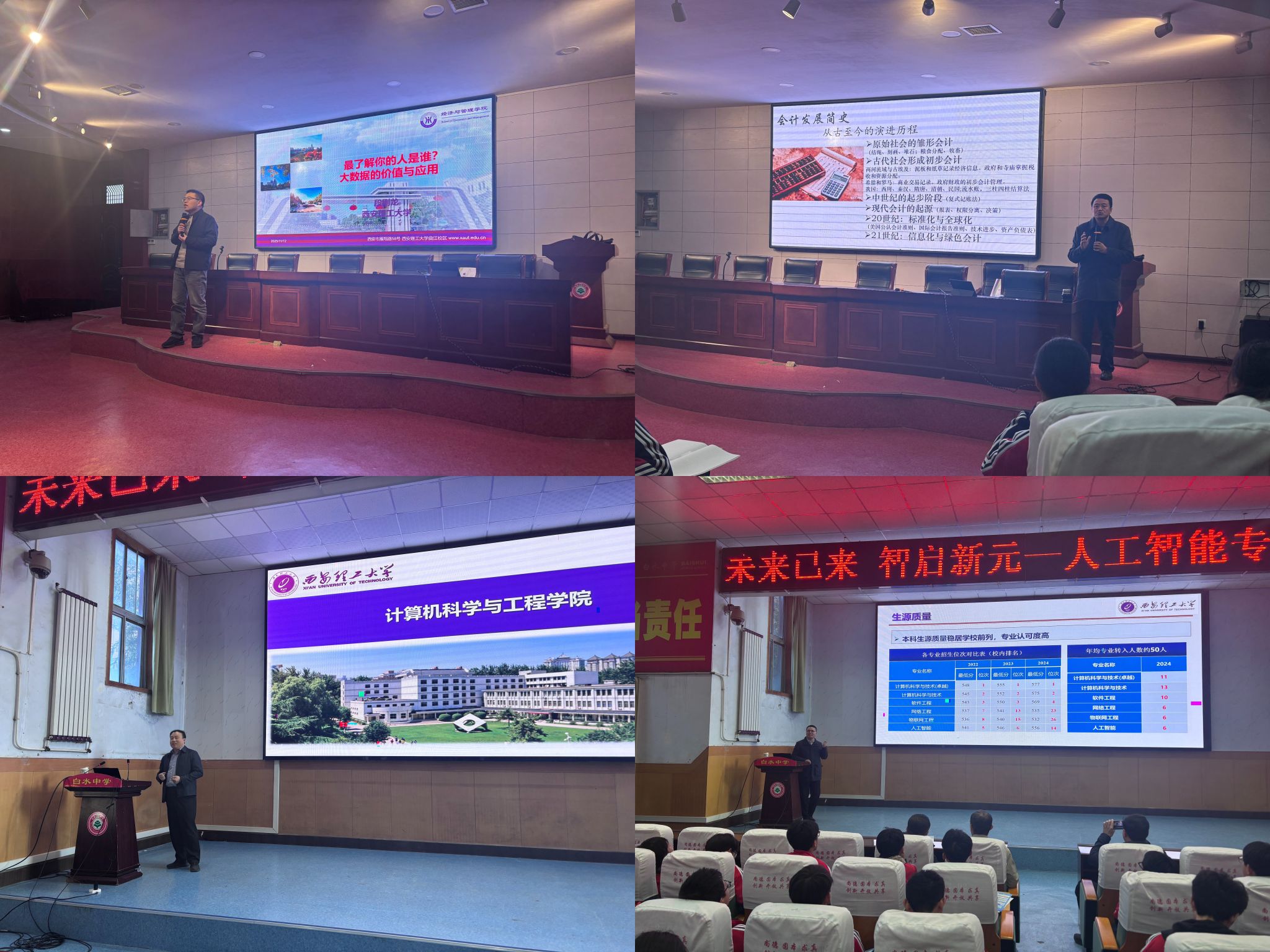 活动中,吴溥峰、段刚龙、傅博、石伟伟四位老师分别向中学生作专题科普报告,涵盖会计学、大数据技术、人工智能技术和机器人等领域的前沿知识,通过深入浅出的讲解激发学生对学科专业的兴趣。在随后的互动环节,教师们结合高校专业设置、学生学业规划、职业生涯成长等方面内容与白水中学师生展开面对面交流,解答师生问题。